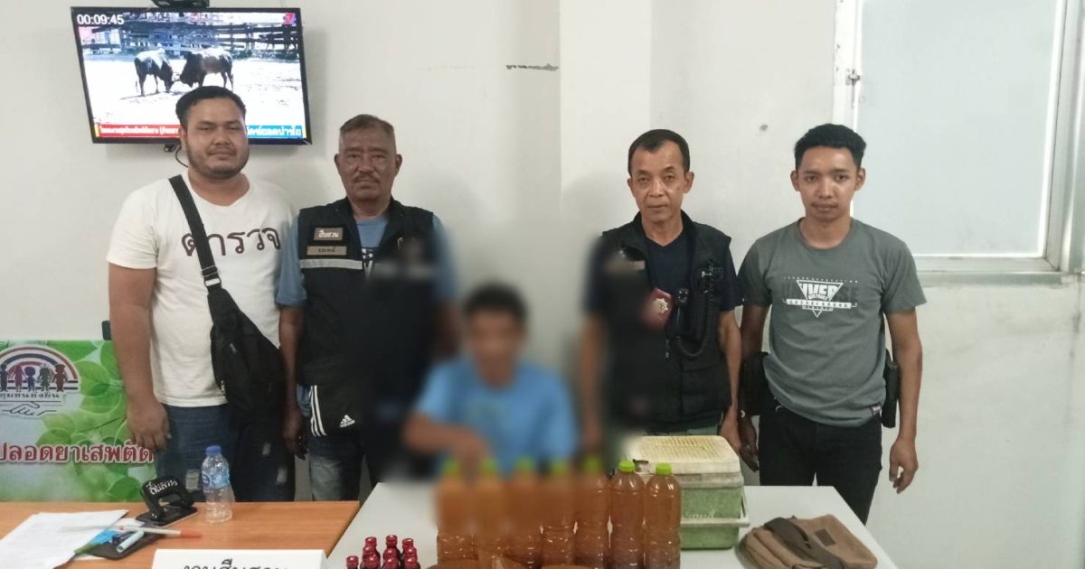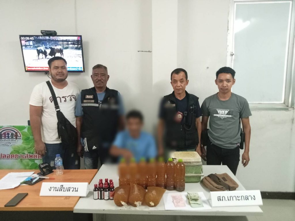 วันนี้ 3 เม ย.2567 เวลา 13.06 น.ภายใต้การอำนวยการสั่งการของ พล.ต.ต.ตานิตย์ รามดิษฐ์ ผบก.ภ.จว. กระบี่ พ.ต.อ.ชวลิต เพชรศรีเปีย รอง ผบก.ภ.จว.กระบี่ พ.ต.อ.พิษณุ อัชนะพรกุล รอง ผบก.ภ.จว.กระบี่ พ.ต.ท.ชาตรี พุธร้อย สว.สภ.เกาะกลาง .ภ.จว.กระบี่ สั่งการให้ ร.ต.อ.เกรียงไกร รักษา รองสว.สส. เจ้าพนักงาน ปปส.เลขที่บัตร 632581 ด.ต.ธนวัตน์ ธรรมราช ส.ต.อ.ธีรยุทธิ์ แก้วอนันต์ ส.ต.ต.วีรศักดิ์ ทับไทร ได้ทำการจับกุม ผู้ต้องหา 1ราย 1 คน พร้อมด้วยของกลาง 1.ยาแก้ไอขนิดน้ำเชื่อม จำนวน 10 ขวด 2.น้ำกระท่อมผสมยาแก้ไอ จำนวน 7 ขวด 3.น้ำกระท่อมบรรจุถุงพลาสติกใสจำนวน 3 ถุง 4.เงินสด (จากการขายน้ำกระท่อม) จำนวน 500 บาท โดยแจ้งข้อกล่าวหาว่า โดยแจ้งข้อกล่าวหาว่า ขายยาแผนปัจจุบัน(ยาแก้ไอ)โดยไม่ได้รับอนุญาต, จำหน่ายอาหารที่มีพืชกระท่อมเป็นส่วนผสมโดยไม่ได้รับอนุญาต อันเป็นความผิดตาม มาตรา50 ของพระราชบัญญัติอาหาร พ.ศ.2522 ตามประกาศของกระทรวงสาธารณสุข (ฉบับที่ 424) พ.ศ2564 นำส่งพงส.สภ.เกาะกลาง ดำเนินการต่อไป